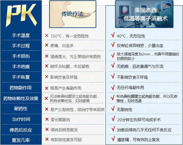 5、传统激光微波手术:手术时间1-2小时,一般1-3个月见效,该治疗创伤大,患者在术后无法正常工作与学习,术中的高温对鼻粘膜的损伤大,鼻腔生理功能遭到损伤,反而容易感染其它类型的疾病,可造成不可逆的后果,不建议大家使用。